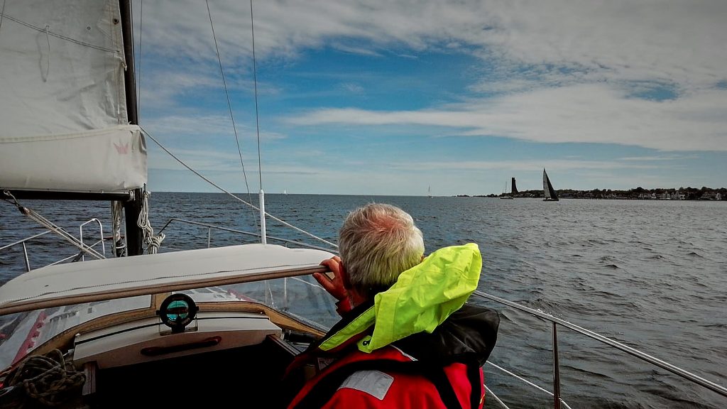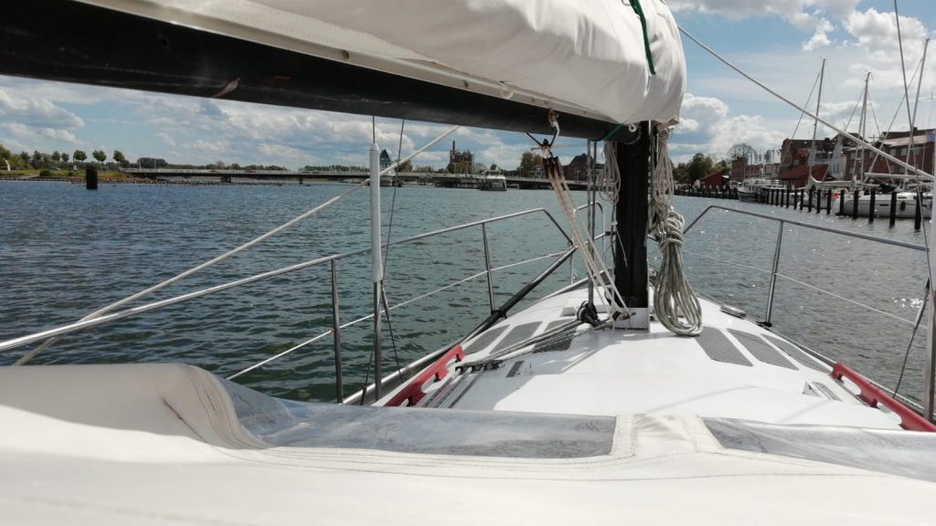 Bei strahlend blauem Himmel ging es früh raus und schnell in der Kieler Bucht Segelsetzen. Ich muss zugeben, dass ich nicht wirklich entspannt war, schließlich hatte Andree noch nie in einem Segelboot gesessen und so habe ich entschieden, nur das Groß zu setzen. Ein Segel hat mir gereicht, damit und dem neuen Boot war ich gut ausgelastet, was meine seglerischen Kompetenzen angeht. Es war schön, aber ich war auch ziemlich gestresst. Die Ostsee mit all ihren Sperrgebieten und unserem Kurs parallel zum Ufer und damit auch zur Welle und achterlichem Wind, war eine echte Herausforderung für mich. Wobei mir dann gleich ein Fehler unterlaufen ist, in dem ich den Traveller des Großsegels nicht fixiert hatte und er so hin und her rutschen konnte. Das hat leider dazu geführt, dass beim Überkommen des Segels, Andree die Großschot an den Kopf und vor allem an die neue Brille bekommen hat, die danach repariert werden musste. Wir waren mit dem Großsegel alleine nicht schnell genug und uns lief die Zeit davon, um rechtzeitig nach Schleswig zu kommen. So beschloss ich Segel einholen und Motor an. Auch hier wieder der Wunsch, nicht zu viele Möglichkeiten gleichzeitig zu haben. Segel oder Motor. Das Ergebnis war, dass Julia uns mal gezeigt hat, wie schön sie rollen kann. Hat aber alles geklappt und wenn ich ehrlich bin tierischen Spaß gemacht. Wir haben sogar auf Anhieb die Schlei gefunden.