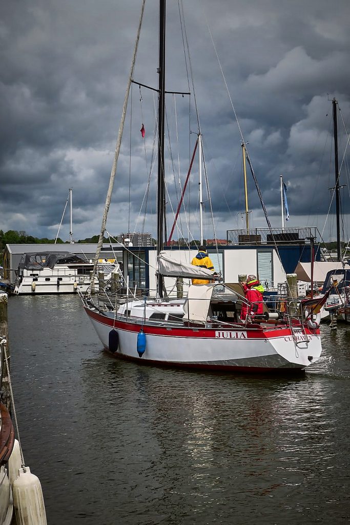Für uns Superleichtmatrosen, war es keine Selbstverständlichkeit all die Bojen zu finden und in Fahrwasser zu bleiben, aber es war richtig toll. Ein bisschen Spannung, was kommt da nach der nächsten Kurve, wo ist die grüne Tonne, und sind wir noch im Fahrwasser. Ab Missunde kam der große See und ds Wetter wurde zunehmend schlechter. Am anfang konnten wir den Wikingerturm sehen aber bald verschwand er in einem dicke grau und wir haben eigentlich eher nach dem Tablet navigiert, als draußen etwas zu sehen. Und dann peng blauer Himmel da ist der Turm und wir fahren in den Hafen. Unsere Frauen warten bereits am Steg, und machen die ersten Fotos.